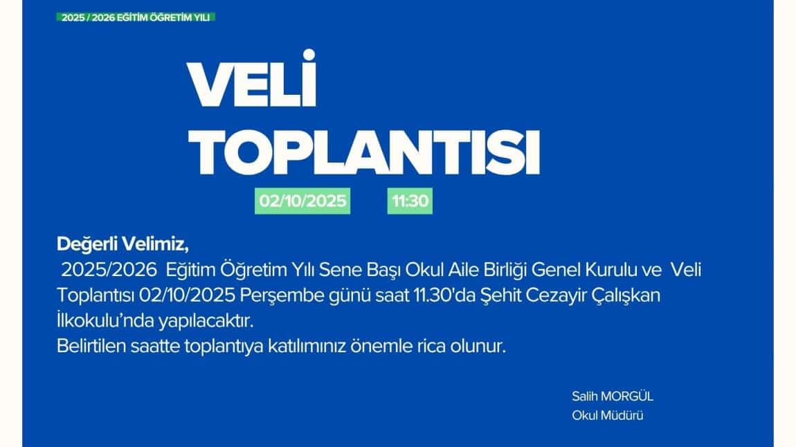 2025-2026 Eğitim Öğretim Yılı Sene Başı Okul Aile Birliği Genel Kurul Toplantısı ve Veli Toplantısı 02/10/2025 Perşembe günü saat 11:30'da Şehit Cezayir Çalışkan İlkokulunda yapılacaktır.